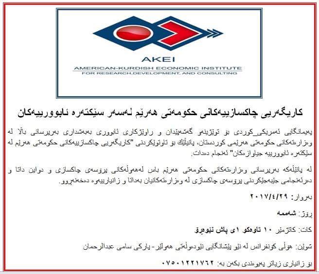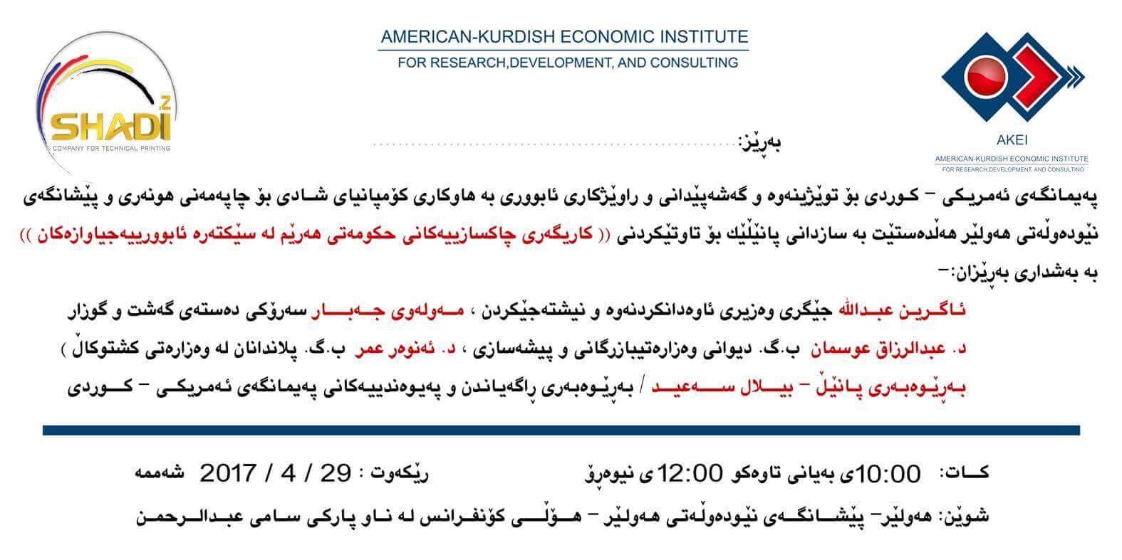 AKEI is an economic institute that established and registered in U.S. The opening ceremony was held in Erbil December 19, at Saad Abdulla hall and was attended by several KRG officials, and U.S. Consul General which announced their support for the work of the institute in Kurdistan.